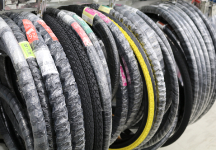 自転車のタイヤと一口に言っても、いわゆるママチャリのタイヤや電動アシスト自転車のタイヤ、お子様を乗せる自転車など、自転車によってタイヤの幅や直径のサイズが様々です。自転車専門店の当店の在庫はいつも多めに取り揃えていますので、タイヤのトラブルでお困りの際はお立ち寄りください。